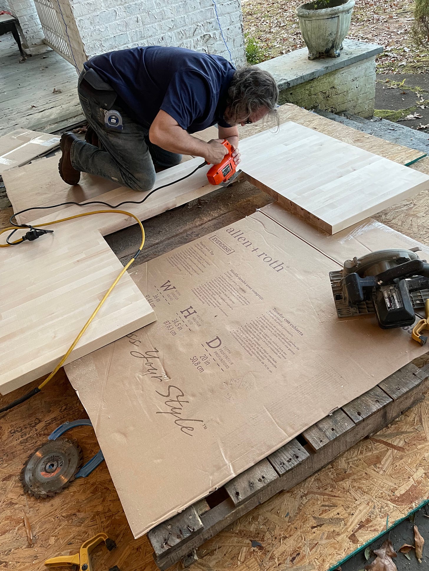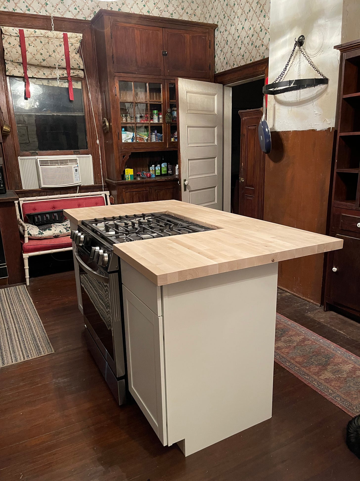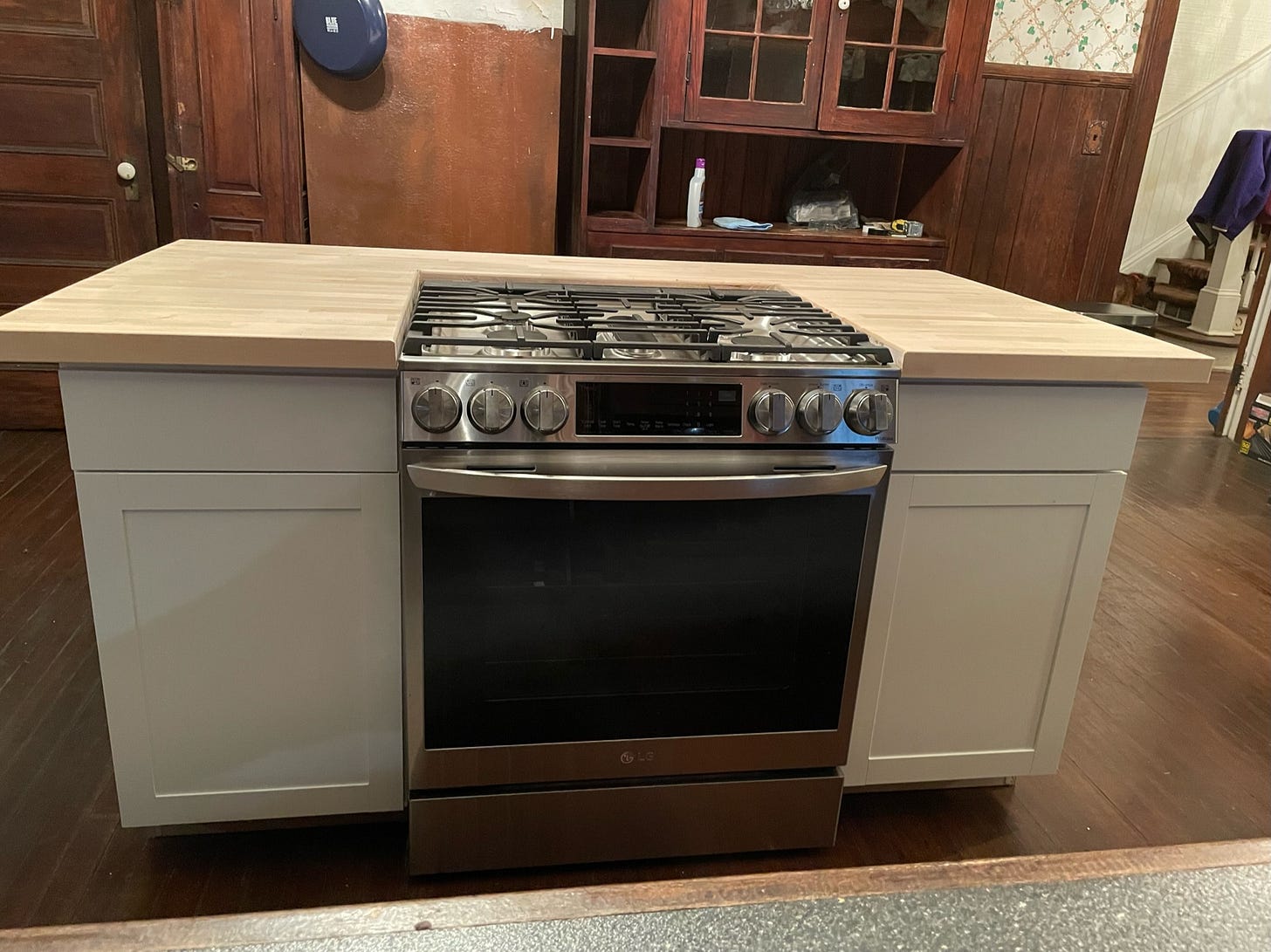 Put in new cabinets on either side of the stove and decided on a butcher block for the top. We (and when I say we, I mean Mike) had to cut out a piece of the block to accommodate the stove. That was a bit stressful. Measure twice (or three or four times), cut once.